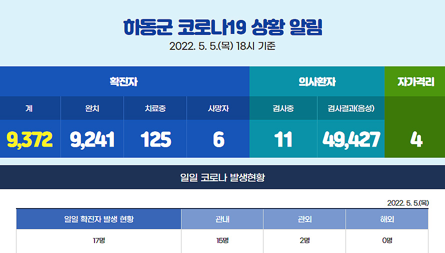 경남 하동의 코로나 19 추가 확진자가 5일 오후 6시 기준(전날 오후 6시 이후)으로 괸내 15명과 관외 2명 등 모두 17명이 발생해 누적 확진자는 9천 372명으로 집계됐다. 누적 사망자수는 6명으로 멈추고 있다.