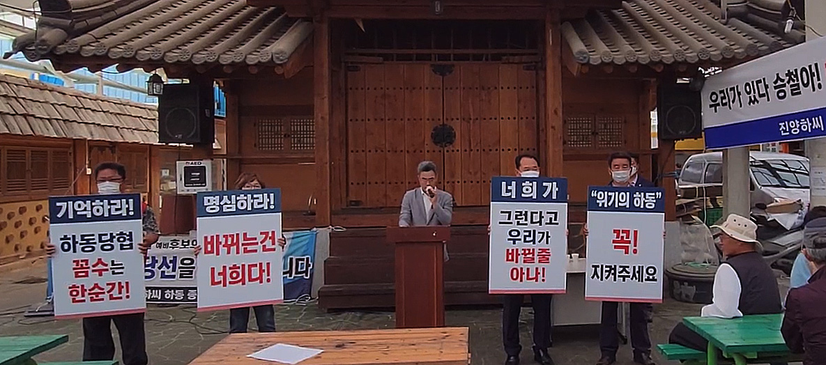 이들은 ‘위기의 하동 꼭 지켜주세요’, ‘기억하라!하동당협 꼼수는 한순간’, ‘명심하라!바뀌는 건 너희다’, '너희가 그런다고 우리가 바뀔줄 아냐', 등이 적힌 손팻말로 탈당과 지지선언를 선언했다.