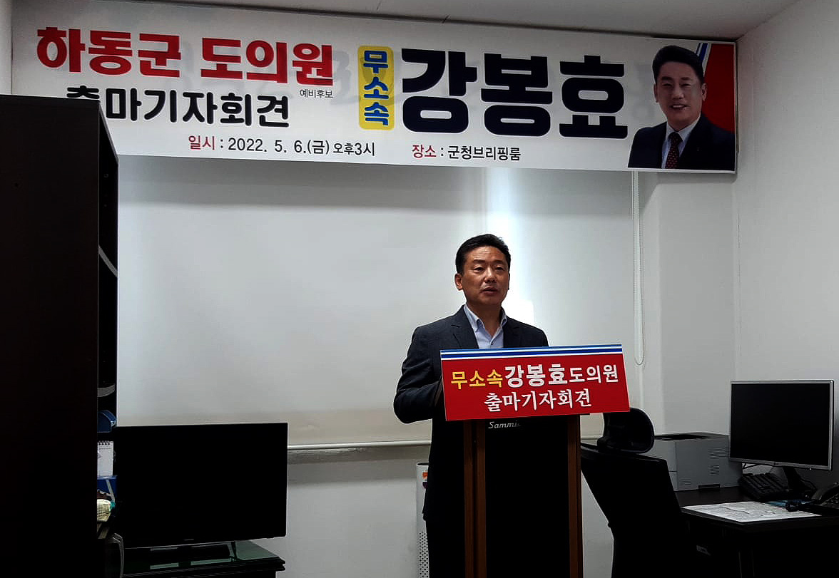 올해 53살인 강봉효 도의원 예비후보는 앞서 오전에 국민의힘 경남도당에 탈당계를 제출하고 오후 3시 하동군청 브리핑룸에서 기자회견을 열고 도의원 선거 무소속 출마를 선언했다.