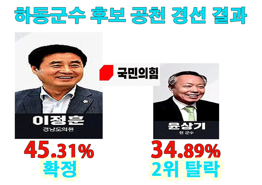 이정훈 예비후보는 경선에서 45.31%로 하동군수 후보로 공천되고, 윤상기 하동군수는 34.89% 경선 2위로 탈락했다.