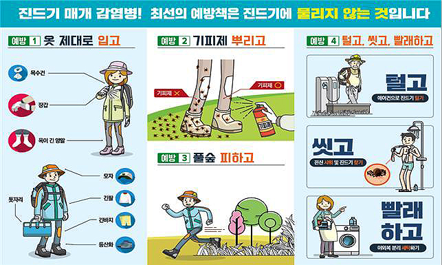 또한 풀밭 위에 옷을 벗어두거나 앉지 않으며, 귀가 즉시 착용 복장 일체를 세탁한다. 그리고 목욕하면서 몸에 진드기가 붙어 있는지 꼼꼼하게 확인해야 한다.