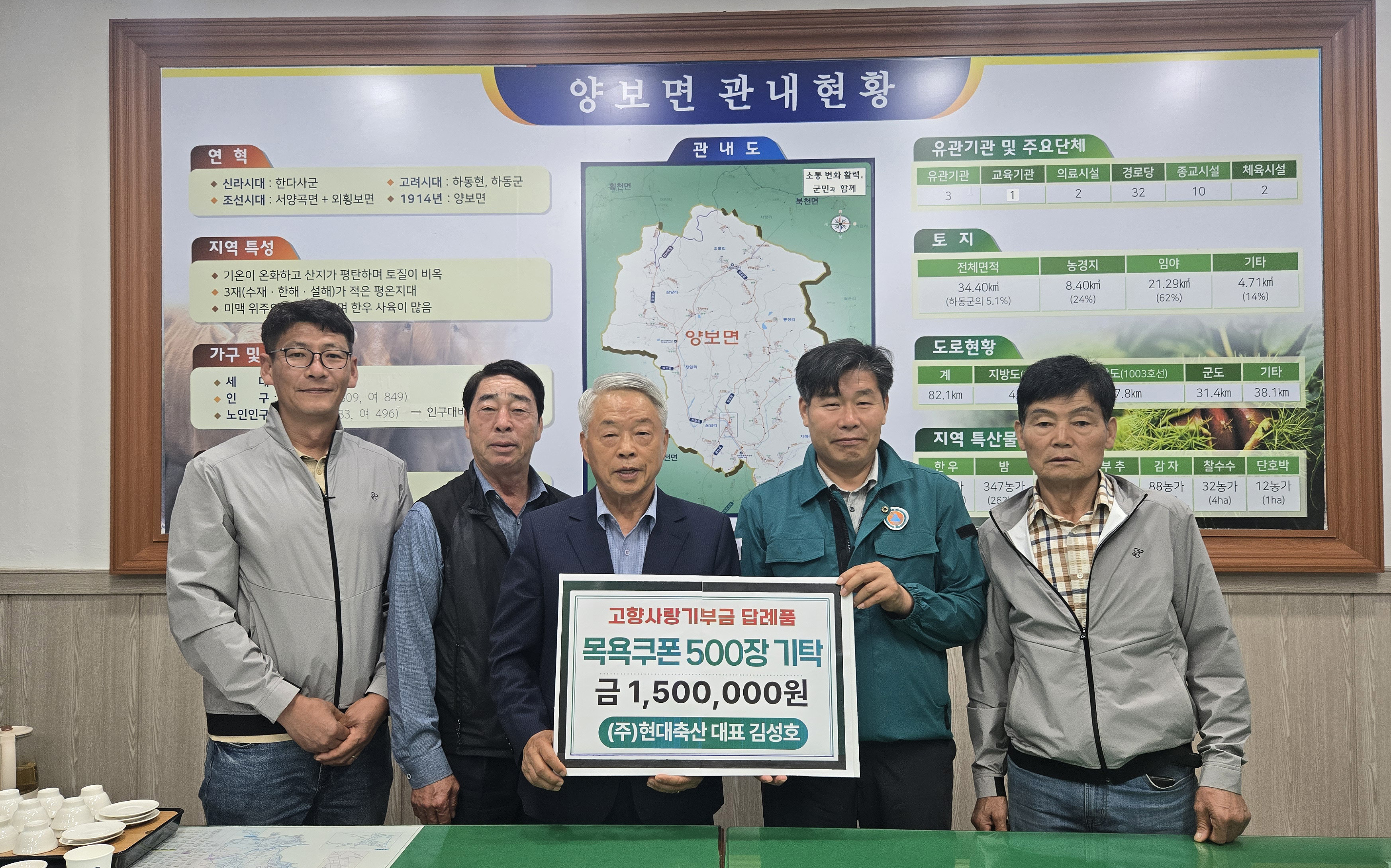 김해시에서 ㈜현대축산을 운영 중인 (전)재부하동향우회 김성호 대표가 13일 하동군 양보면에 150만 원 상당의 목욕(효도) 쿠폰 500장을 전달했다.