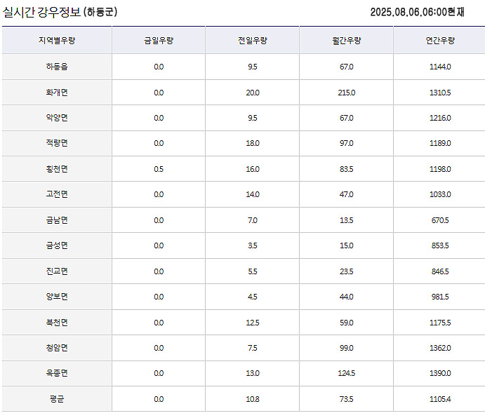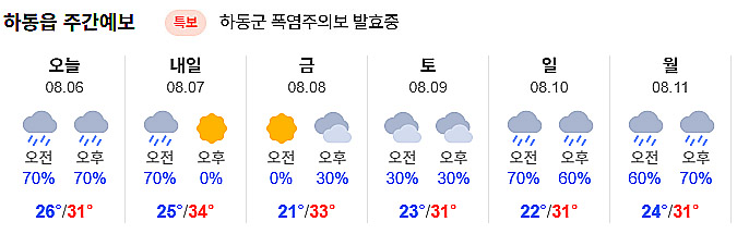8월 6일 수요일 경남 하동지역 흐린 가운데 비가 오락가락하니 나오실 때 우산 챙겨주셔야겠습니다.