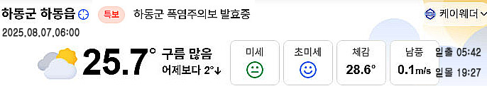 오늘(7일) 하동지역 아침 6시 현재 구름이 걷히면서 맑은 하늘 보이고 있는데요. 기온은 어제보다 2도 낮은 25.7도, 체감온도는 28.6도 보이고 있습니다.