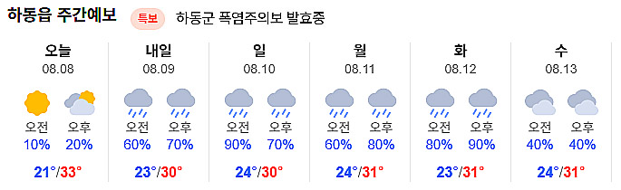 이날 경남 하동지역 아침 최저기온 21도로 출발해 낮 최고기온은 33도로 폭염주의보가 계속 발효중에 있어 후텁지근한 날씨에 건강 잃지 않도록 주의하셔야겠습니다.