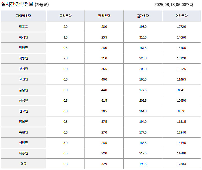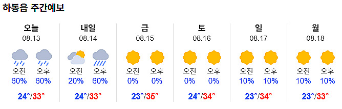 | [하동날씨] 하동 종일 비 5∼40mm (2) | 2025.08.12 |