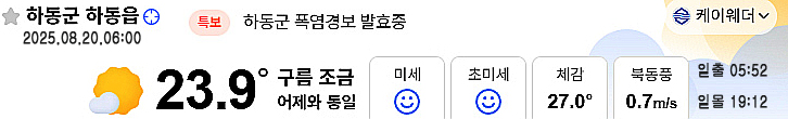 이날 아침 최저기온 23도로 출발한 하동은 아침 6시 현재 어제와 같은 23.9도, 체감온도 27.0도로 구름 조금 낀 하늘 보이고 있습니다.