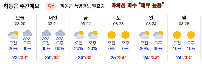 수요일인 8월 20일 경남 하동은 폭염경보가 발효중인 가운데 낮 최고기온이 33도까지 오르는 등 무더운 날씨가 이어지겠습니다.