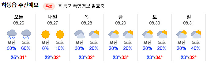 | [하동날씨]주말 처서 하동, 최고 체감 35도 안팎 불볕더위 (0) | 2025.08.23 |