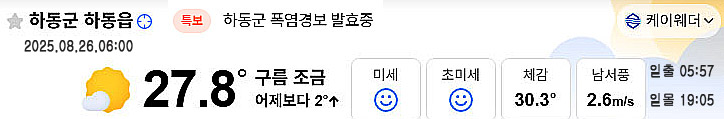 26일 아침 6시 현재 경남 하동지역 기온은 27.8도 가리키고 있는데요. 체감 온도는 30.3도로 높게 출발하고 있습니다.