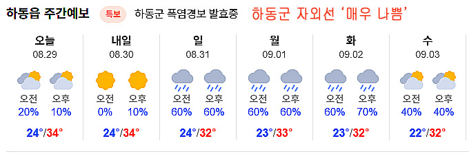 | 하동 날씨, 오늘 3-80mm의 비...폭염주의보 한낮 32도 (2) | 2025.09.01 |