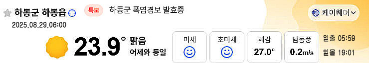 한편 8월 29일 금요일 아침 6시 현재 하동읍 맑은 하늘보이면서 아침 기온 23.9도로 어제와 같은데요. 체감온도는 27도 가리키고 잇습니다.