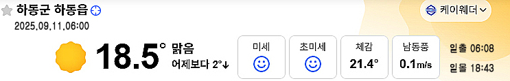 한편 9월 11일 목요일 아침 6시 현재 경남 하동지역 맑은 하늘 보이고 있는데요. 아침 기온도 어제(10일)보다 2도 낮은 18.5도, 체감온도 21.4도로 선선하게 출발하고 있습니다.