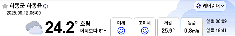 | 하동 날씨, 흐린 하늘 낮 기온 30도 더위 …일교차 주의 (0) | 2025.09.10 |