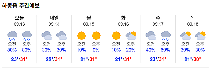 | 하동 날씨, 낮 기온 32도 늦더위 (1) | 2025.09.14 |