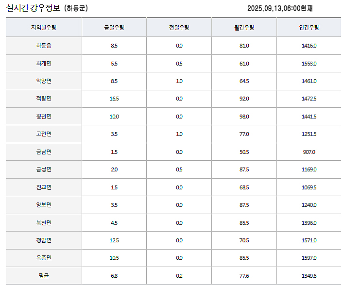 오늘 아침 6시까지 밤사이 하동지역에 내린 비의 양은 6.8mm, 적량면이 16.5mm로 가장 많았고 금남면이 1.5mm로 가장 적었습니다. 하동읍은 8.5mm의 강우량을 보이고 있습니다.