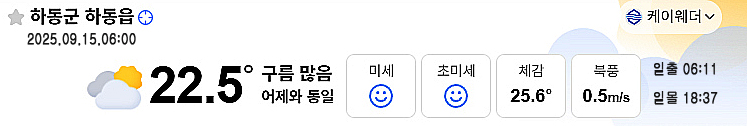 | 하동 날씨, 낮 기온 32도 늦더위 (1) | 2025.09.14 |