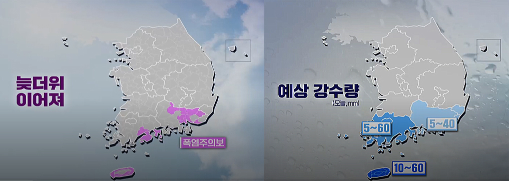 제주에 10에서 60, 전남은 5에서 60, 경남 지방에서는 5에서 40밀리미터의 오락가락 비가 예상되는데요. 우리 경남 하동지역은 오후에 약한 비가 내릴 것으로 보입니다.