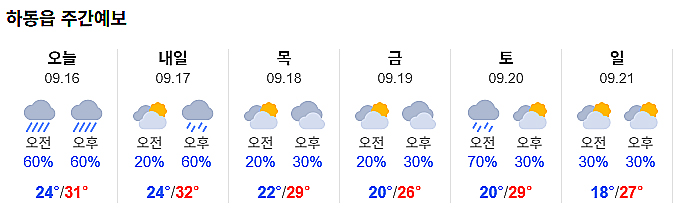 | 하동 날씨, 늦더위 이어져·한낮 31도...오후 한 때 약한 비 (1) | 2025.09.15 |