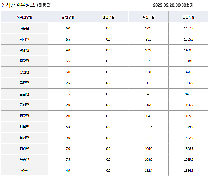 9월 20일 오전 6시 현재 경남 하동지역도 주말 아침 가을비가 강하게 내리고 있습니다.