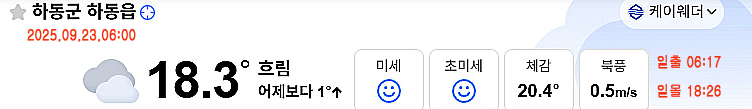 오늘(22일) 아침 6시 현재 하동군 하동읍 흐린하늘 보이고 있는데요. 아침 기온은 18.3도(체감온도 20.4도)로 쌀쌀한 아침입니다.