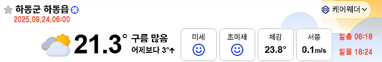 오늘(24일) 아침 6시 현재 경남 하동군 하동읍의 아침 기온은 어제보다 3도 높은 21.3도(체감 온도 23.8도)로 선선하게 출발하고 있으며, 구름많은 하늘 보이고 있습니다.