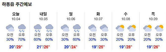 | 하동 날씨,대체로 흐리고 밤에 5mm 안팎의 비 지나 (0) | 2025.10.05 |