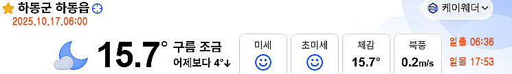 17일 아침 6시 현재 경남 하동지역 구름 조금낀 가운데 아침 기온은 어제보다 4도 낮은 15.7도 보이고 있는데요.