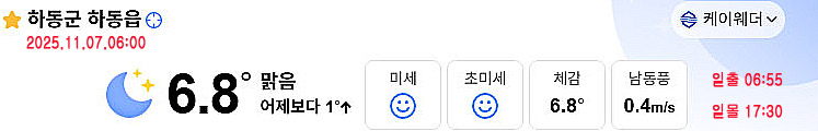 | 하동 한낮 23도 온화한 날씨...큰 일교차 유의 (0) | 2025.11.06 |