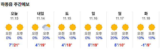 목요일인 오늘(13일) 경남 하동지역의 아침 최저기온은 7도, 낮 최고기온은 21도로 예상됩니다.
