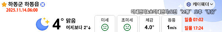 | 주말 하동 날씨,맑고 낮 기온 18도...큰 일교차 (0) | 2025.11.15 |
