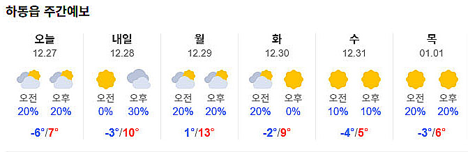 | 하동 날씨, 대체로 맑고 다시 추위 대비...한낮 10도 안팎 (1) | 2025.12.30 |