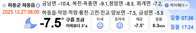 | 하동 날씨, 한파주의보 발효 중...올겨울 들어 가장 추운 아침 (0) | 2025.12.26 |