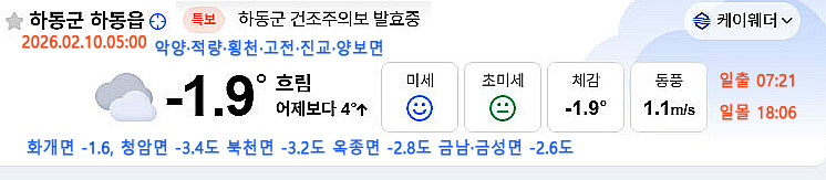 | 하동 날씨>오후부터 맑고 온화..오후부터 공기질도 나빠 (0) | 2026.02.11 |