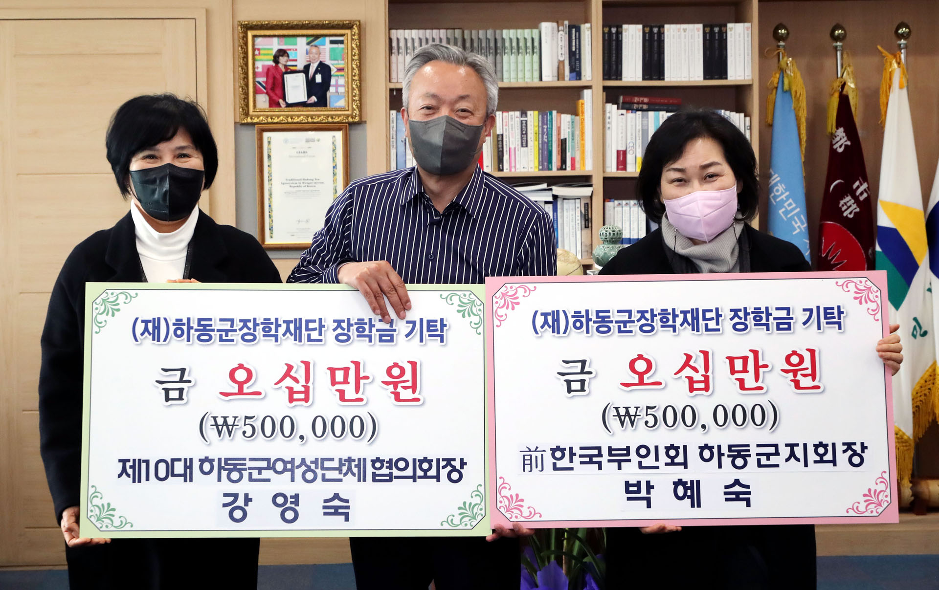 하동군장학재단, 여성단체협의회 강영숙 회장·박혜숙 부회장 100만원 기탁
