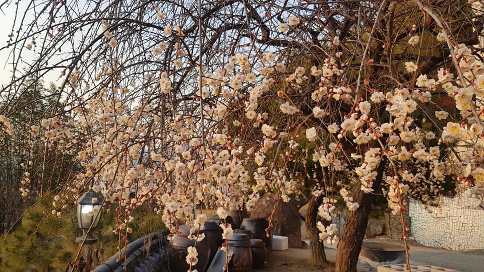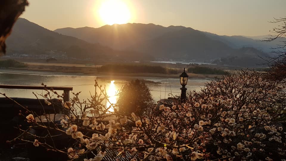 3월 3일 하동읍 섬진강변 물꽃정원. 섬진강물에 비친 일몰의 햇살을 받고 꽃망울을 터트린 핀 매화가 봄소식을 전하고 있습니다.