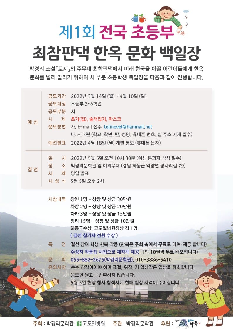 이번 행사는 미래의 한국을 이끌어갈 어린이들에게 우리나라 전통 가옥인 한옥 문화를 널리 알리기 위해 기획됐으며, 특히 박경리 소설 <토지>의 주무대인 최참판댁에서 빼어난 글솜씨를 지닌 미래 역량을 선발하는 것이 목표다.