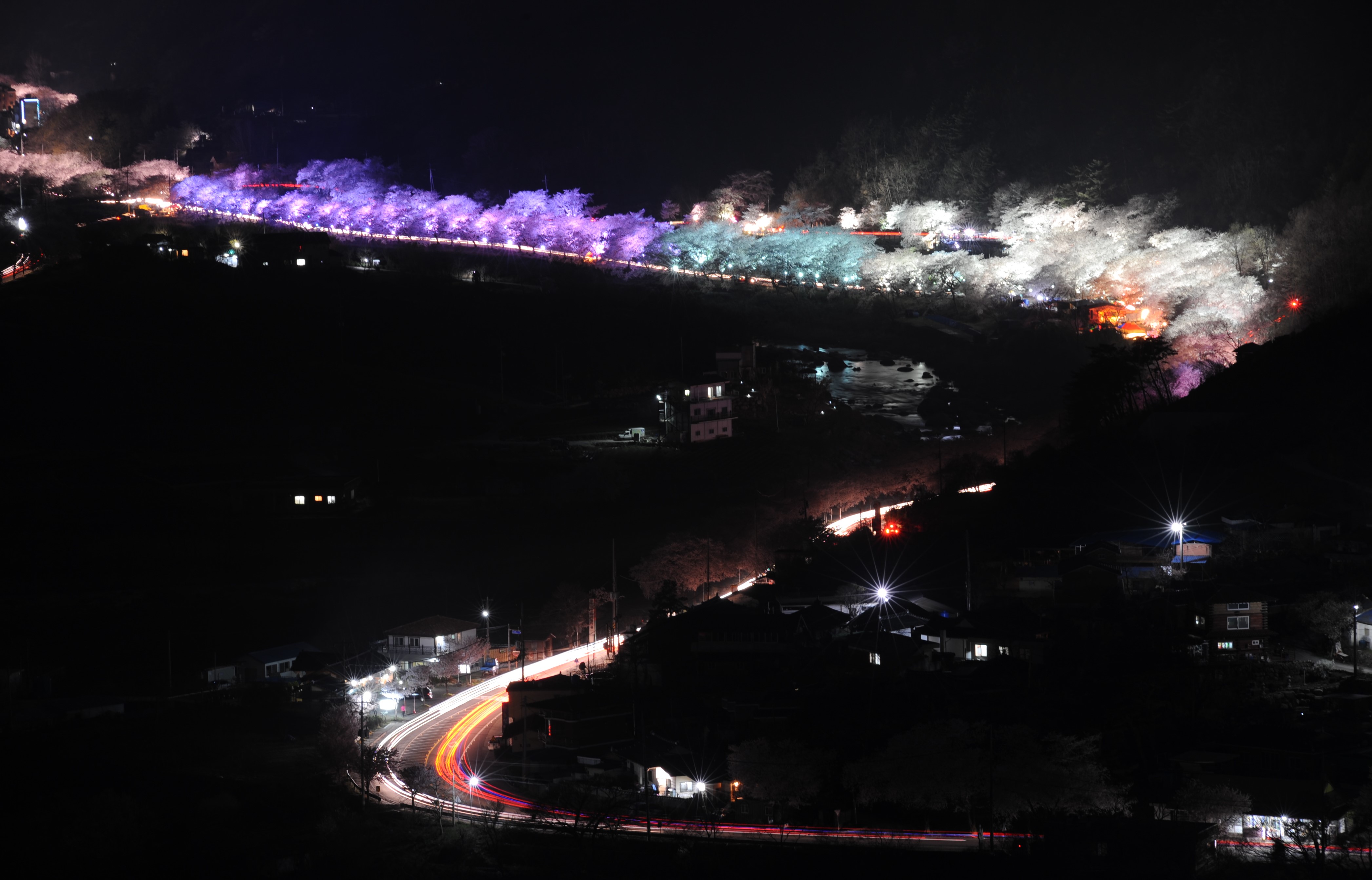 특히 화개중학교 앞 양방향 구간에는 빨강·파랑·보라 등 형형색색으로 변화하는 아름다운 경관조명이 하얀 벚꽃터널과 어우러져 환상적인 분위기를 연출한다.