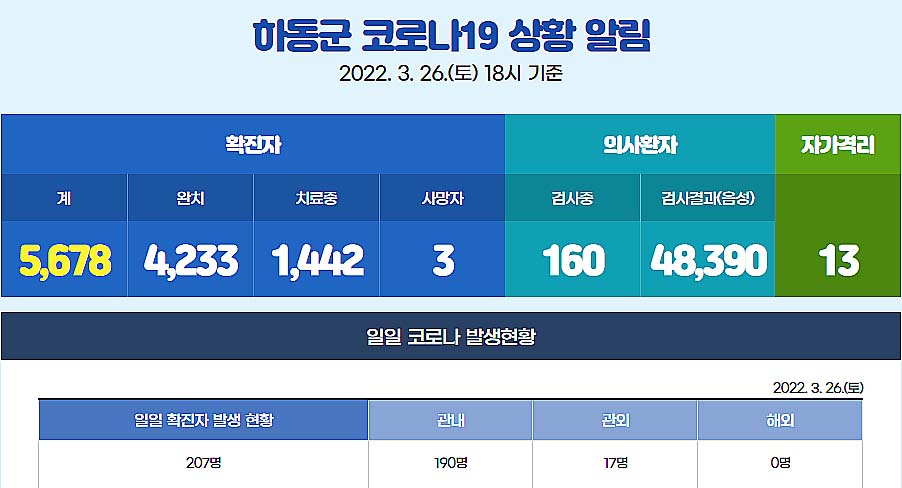 관내 190명, 관외 17명이며, 하동군의 누적 확진자는 5678명으로 집계됐다.