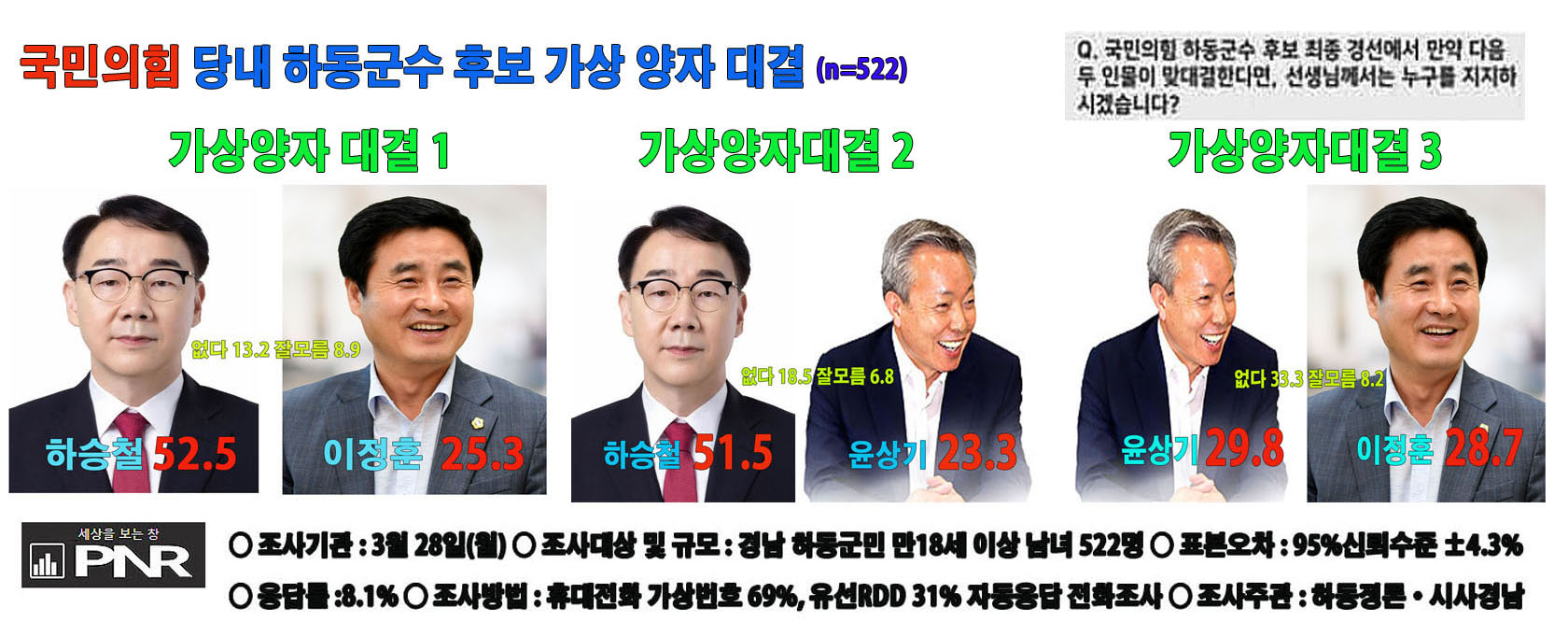 하동 지역신문인 하동정론신문(대표 장성춘)과 시사경남 미래한국연구소 공동으로 여론조사기관인 PNR-(주)피플네트웍스 리서치에 의뢰해 지난 3월28일 하루동안 실시한 ‘하동정론 시사경남 하동군수 선거 국민의힘 후보 적합도 여론조사’에서 하승철 전 부산.진해 경제자유구역 청장이 43.4%, 이정훈 경남도의원 23.1%, 윤상기 하동군수 16.6% 순으로 나타났습니다.