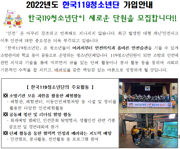 하동소방서(서장 엄민현)는 오는 28일까지 관내 유치원(어린이집)과 초·중·고등학교를 대상으로 2022년 한국119청소년단을 모집한다고 8일 밝혔다.
