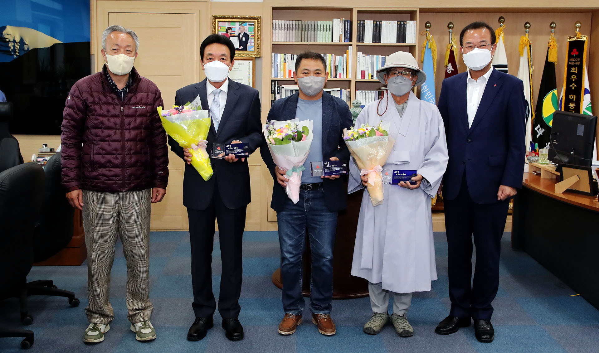 감사패 수여 대상은 자체 생산 패션마스크 5만장을 기탁한 양주시 소재 승리기업 김옥천 대표, 성금 및 상품권 550만원을 기탁한 악양면 소재 청심사 청심다원 지담 주지스님, 성금 500만원을 기탁한 하동읍 소재 ㈜남경 정재한 대표이다.