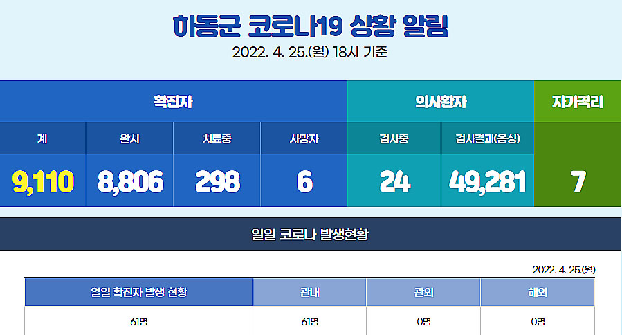하동 코로나19 추가 확진자 61명··누적 9110명