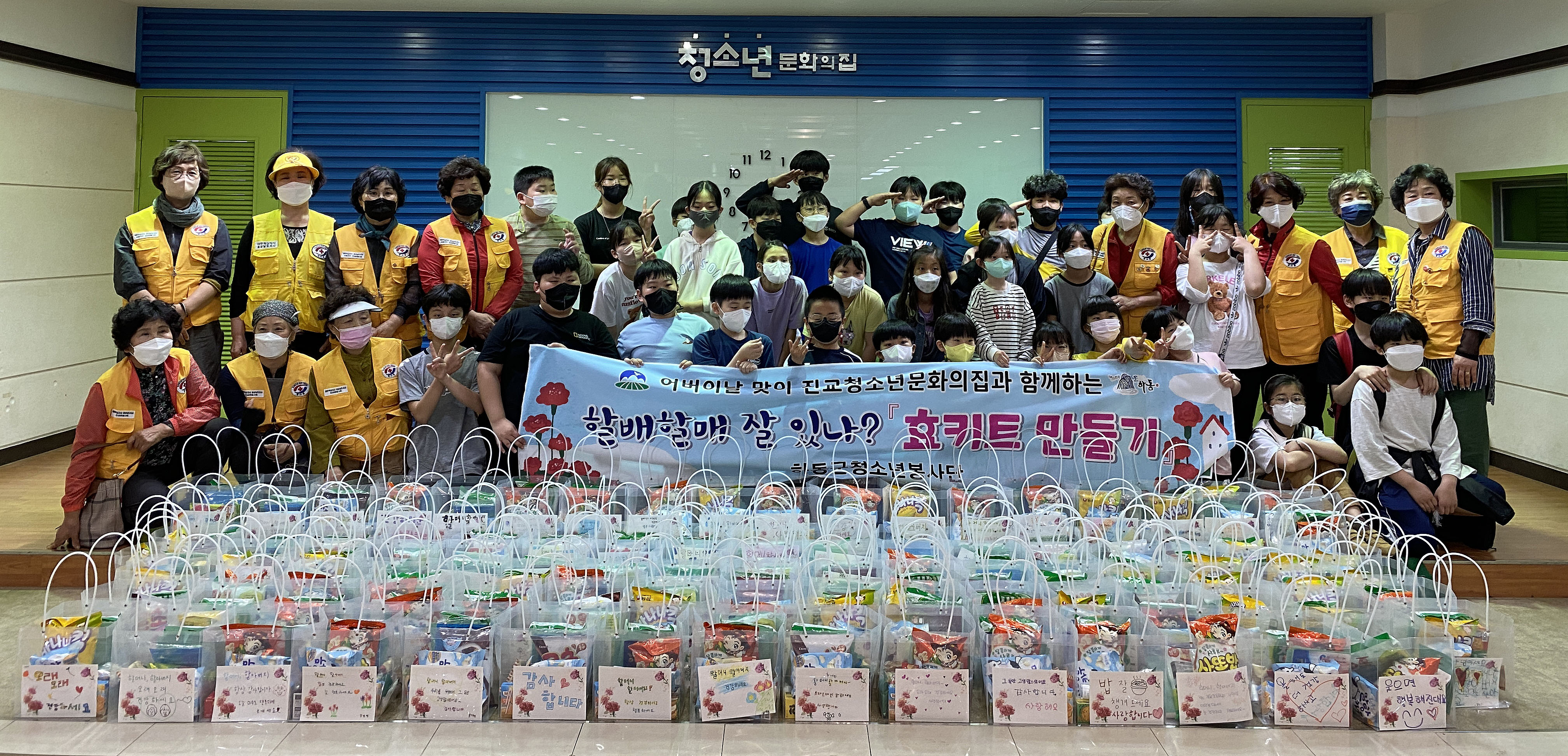 효 키트는 소독제·마스크·파스 2종 등 가정상비용품 4종과 간식 10여 종으로 구성됐으며, 정소연 전 예초미술학원장의 재능기부 봉사자와 연계해 도안을 만들고 청소년 봉사자들이 직접 안부 메시지를 작성한 카드를 동봉했다.