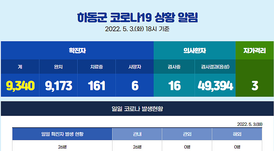 경남 하동군 코로나19 추가 확진자가 3일 오후 6시 기준(전날 오후 6시 이후) 관내에서 26명이 발생해 누적 확진자수는 9천 430명으로 늘어났으며, 사망자는 없어 누적 사망자수는 6명을 유지하고 있다.